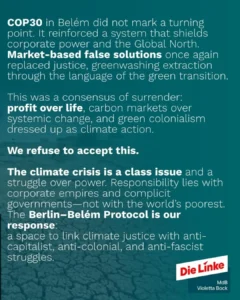 COP30 in Belém did not mark a turning point. Instead, it reinforced a system that shields corporate power and the Global North. Market-based “false solutions” have once again replaced justice, effectively greenwashing extraction through the language of the green transition.